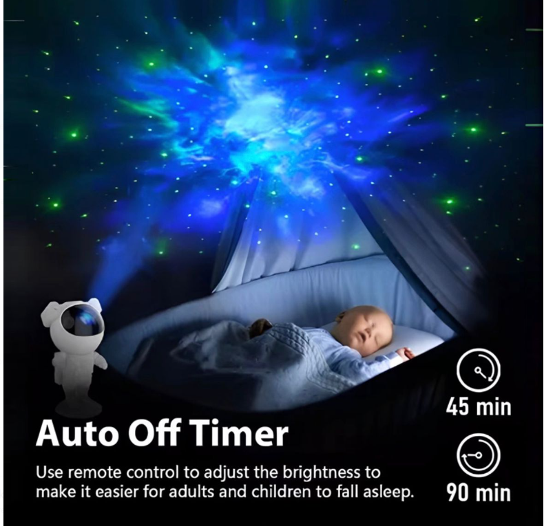 Proyector de estrellas con diseño de astronauta ideal para dormitorios infantiles o espacios relajantes. Proyecta efectos de nebulosa y estrellas sobre el techo o paredes con una lente de alta definición. Su cabeza se puede rotar 360°, tiene brazo ajustable y base magnética desmontable. Incluye control remoto para ajustar brillo, color, velocidad de animación, temporizador y encendido/apagado. Perfecto para crear una atmósfera mágica y ayudar a dormir a niños y adultos.